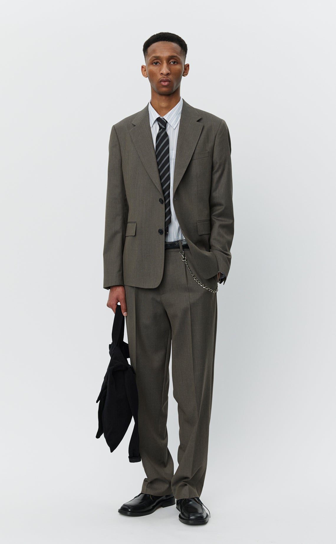 The Single Breasted Blazer has a regular fit with half canvas construction and a light shoulder construction. Featuring flap pockets, welt pocket at chest, internal chest pocket, notch lapel and full lining. Cut from a wool twill with a dry hand feel, in a blend of light grey and brown yarns.