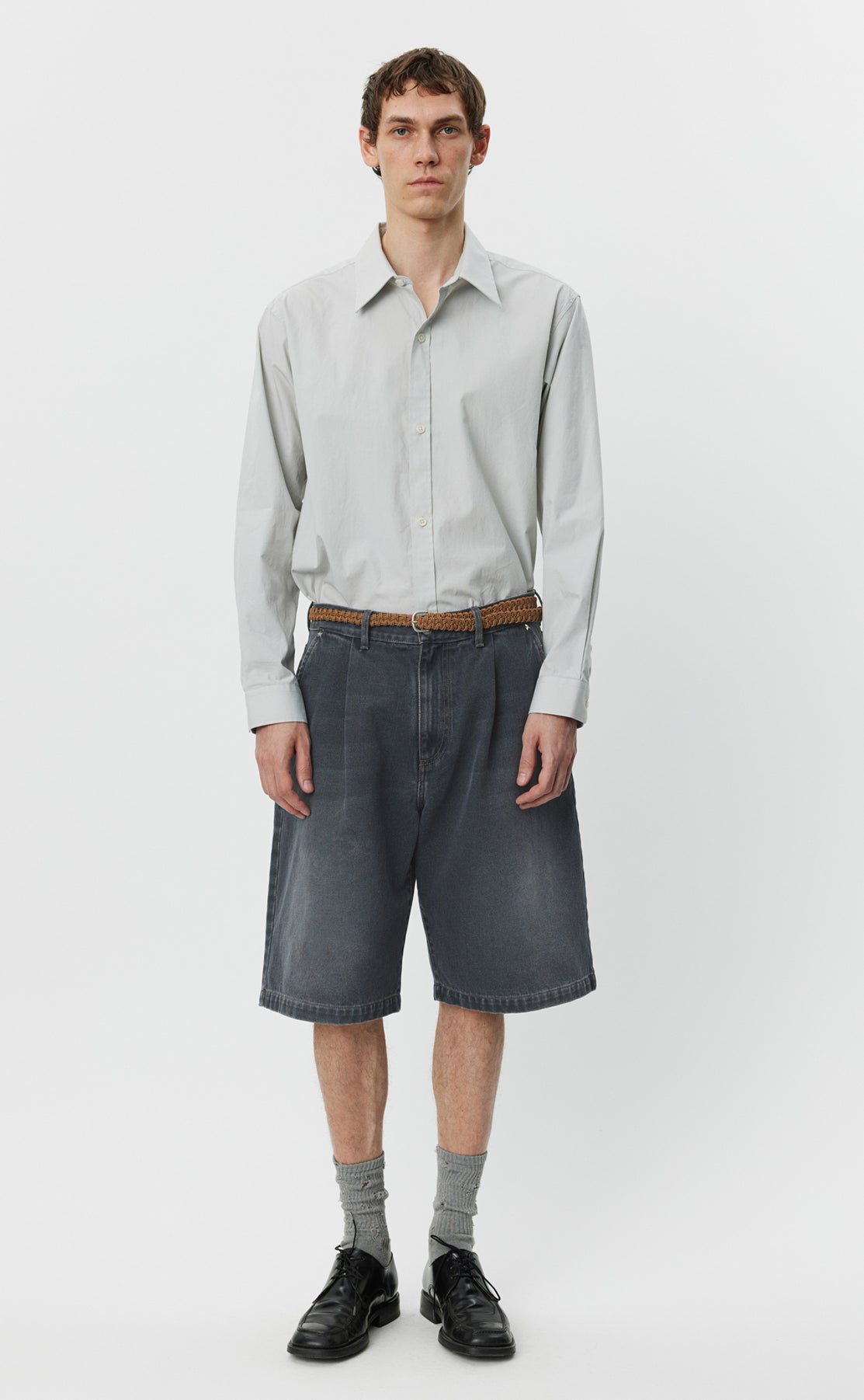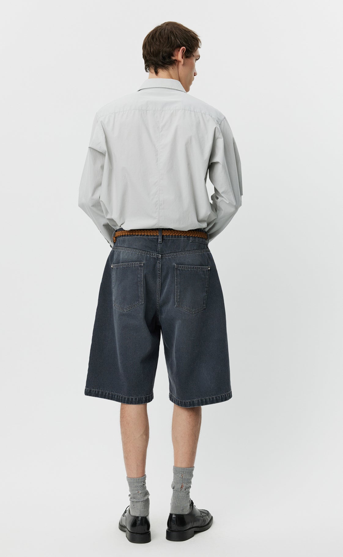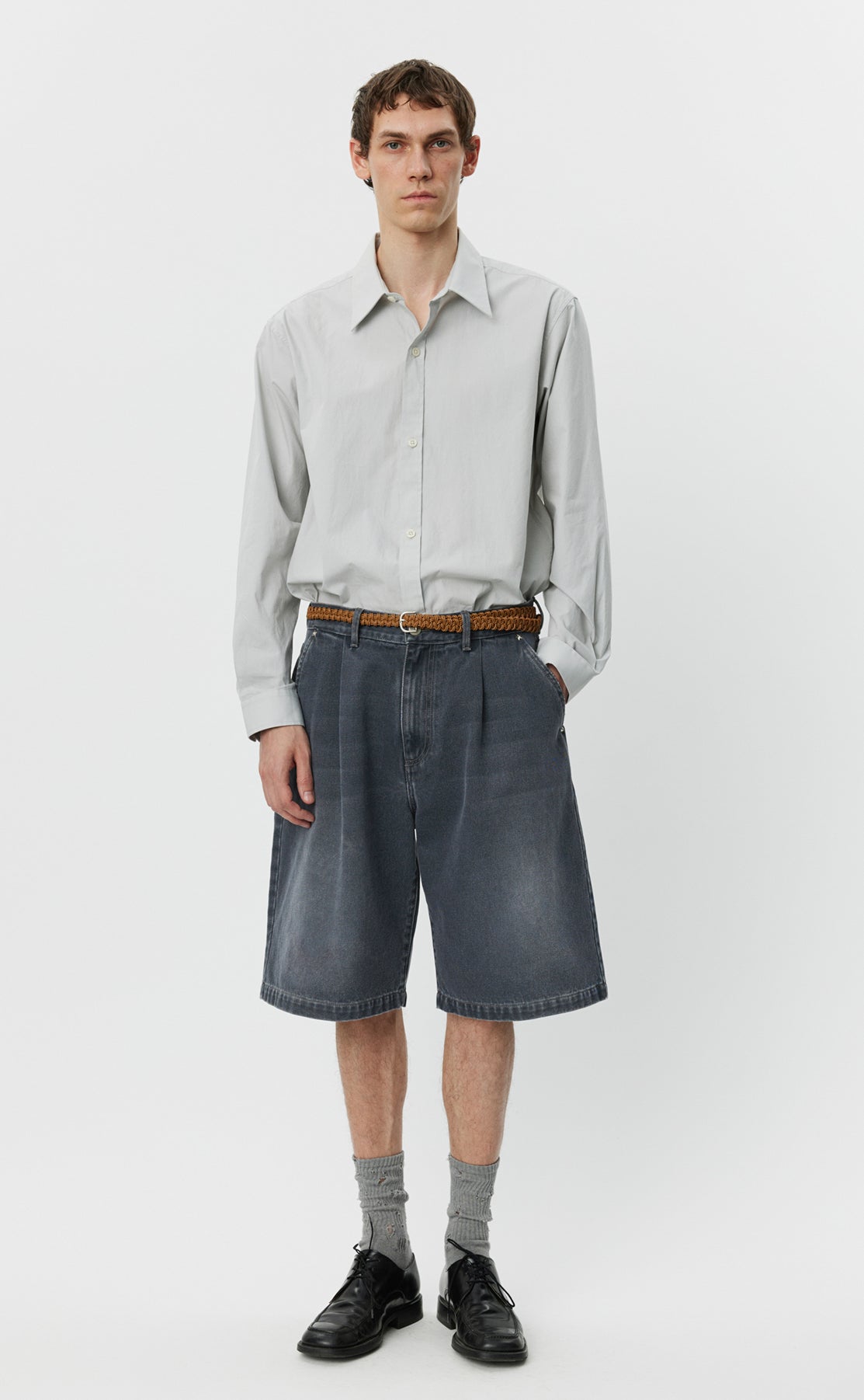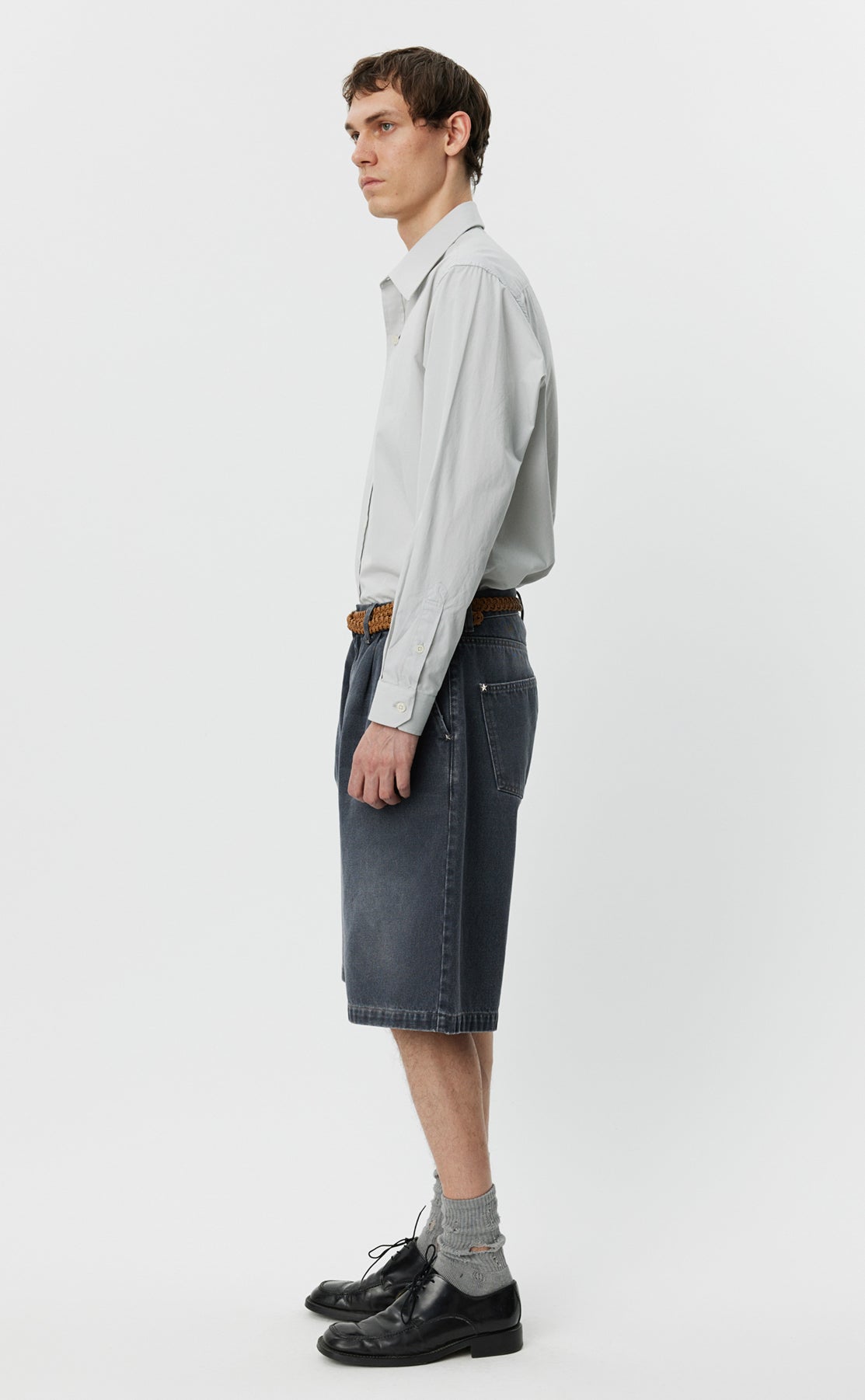 The Star Rivet Shorts have a relaxed straight fit with single pleats and a mid-rise. Made with side pockets and rear patch pockets with star rivets, metal button closure and YKK zip fly. Cut from a washed organic cotton denim twill, with color made from a cold dye.