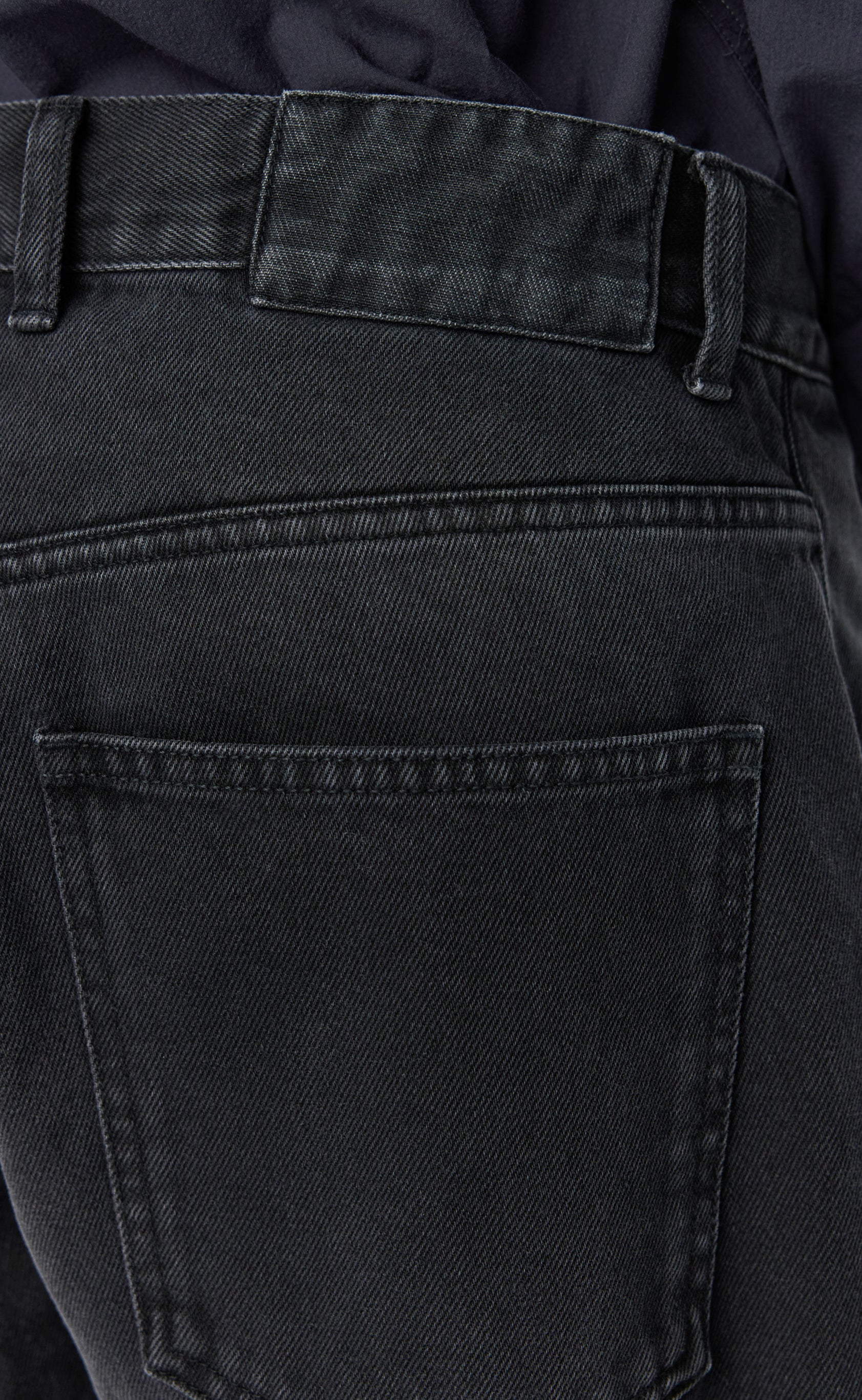 The Straight Cut Jeans have a relaxed straight fit with a mid-rise. Made with side pockets, rear patch pockets, metal button closure and YKK zip fly. Cut from a garment washed organic cotton denim with a dry hand feel in faded black.