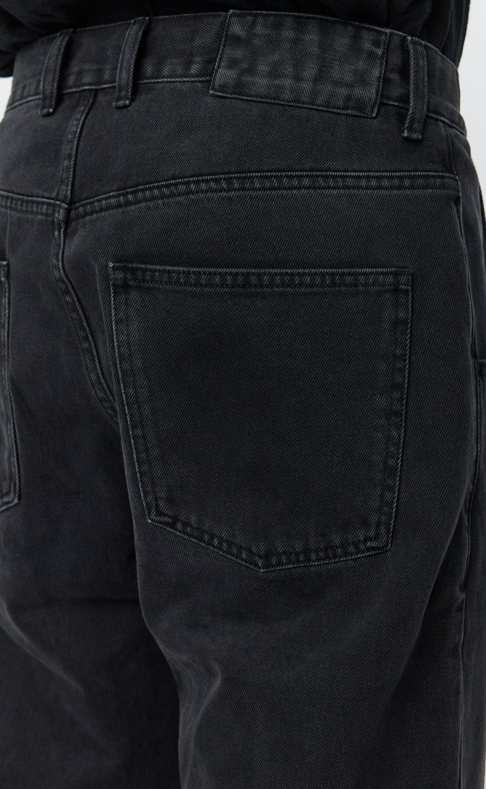 The Straight Cut Jeans has a relaxed straight fit with a mid-rise. Featuring side pockets, rear patch pockets, metal button closure and YKK zip fly. Cut from a garment washed organic cotton denim with a dry hand feel in faded black.