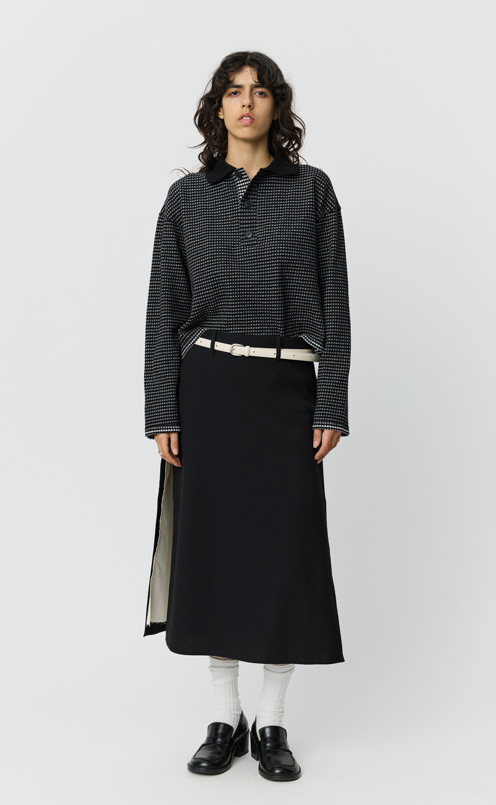 The Tab Skirt is calf length with a regular fit. Featuring a concealed zip opening at the left hip, adjustable tabs at the waist, side pockets, a single patch pocket at the rear, visible raw edged lining and side vents. Cut from a cotton blend with a subtle textured two-tone weave in black.