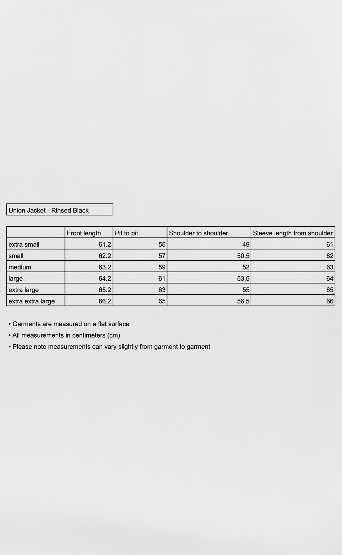 The Union Jacket has a relaxed fit with drop shoulders. Featuring spread collar, side welt pockets, metal button closure and flower rivets at sleeves and side seams. Cut from a garment washed organic cotton denim with a dry hand feel in faded black.