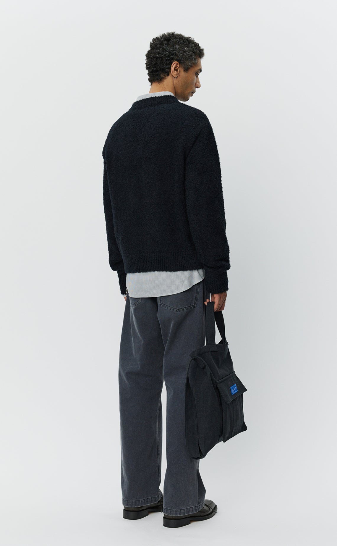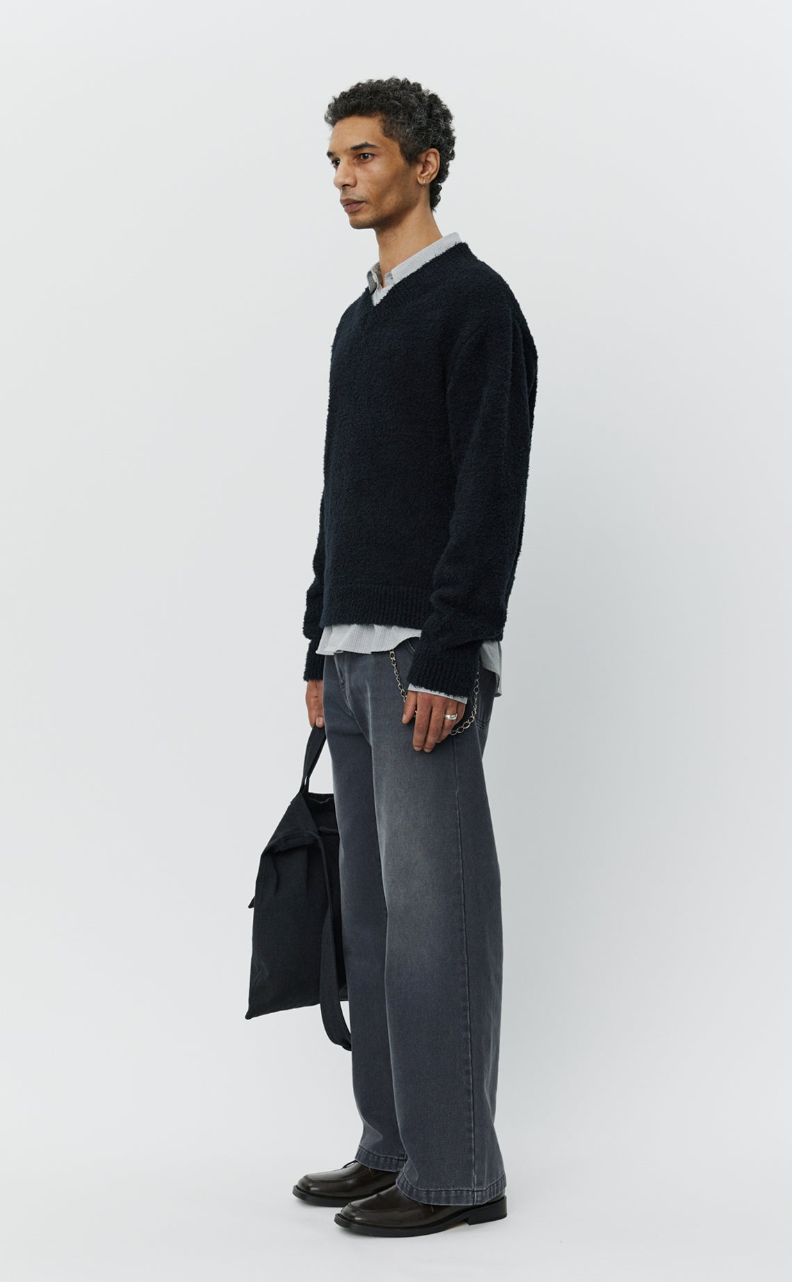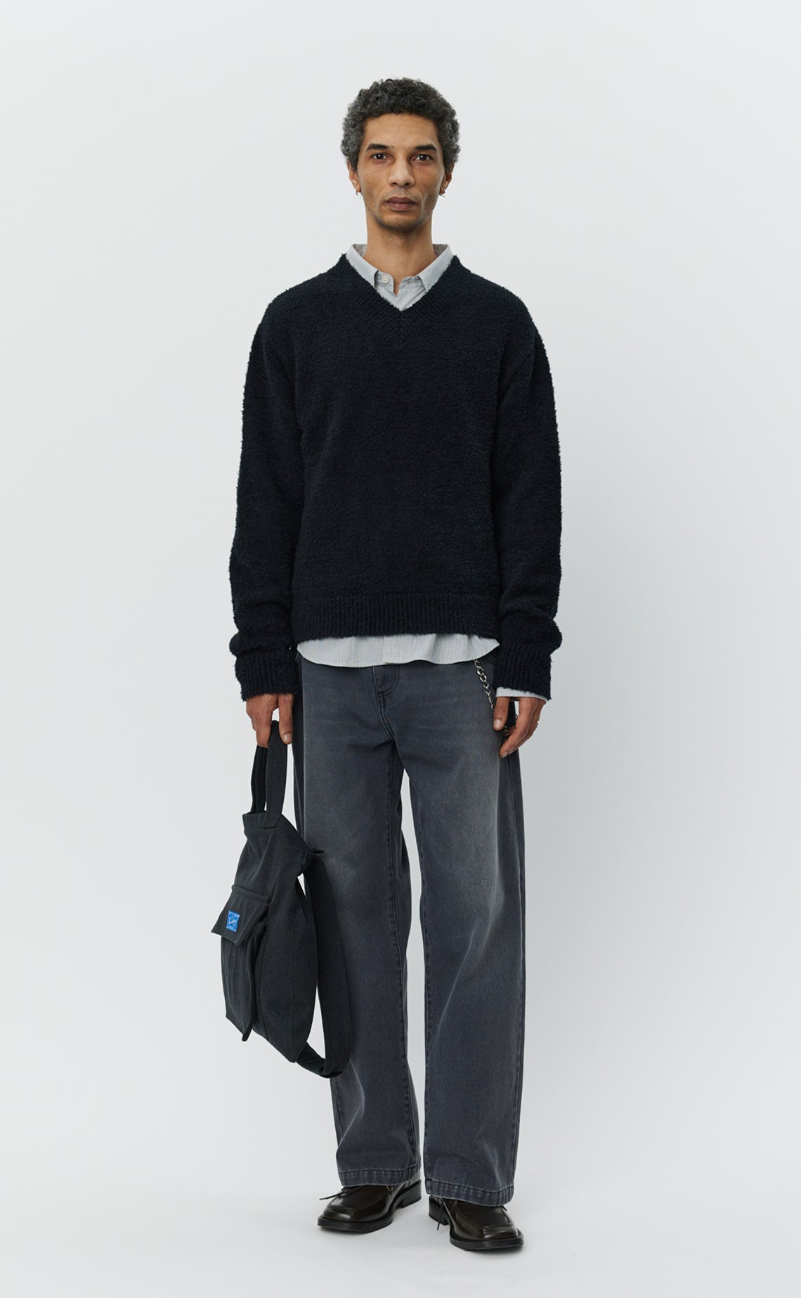The V-neck Sweater has a relaxed fit with dropped shoulders. Knitted from an organic cotton with a fuzzy texture in black and finished with a 1x1 rib at V-neck, hem and cuffs.