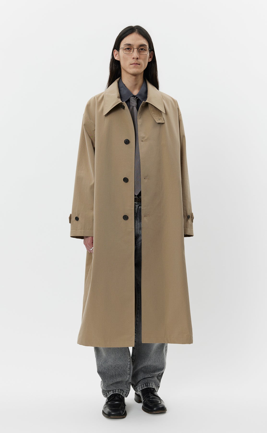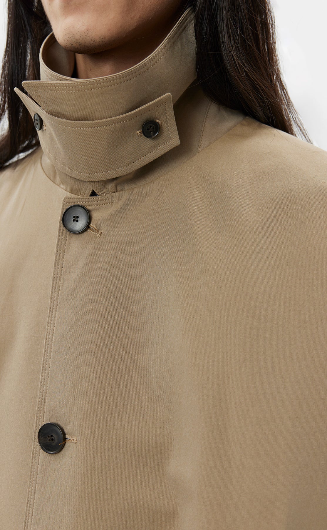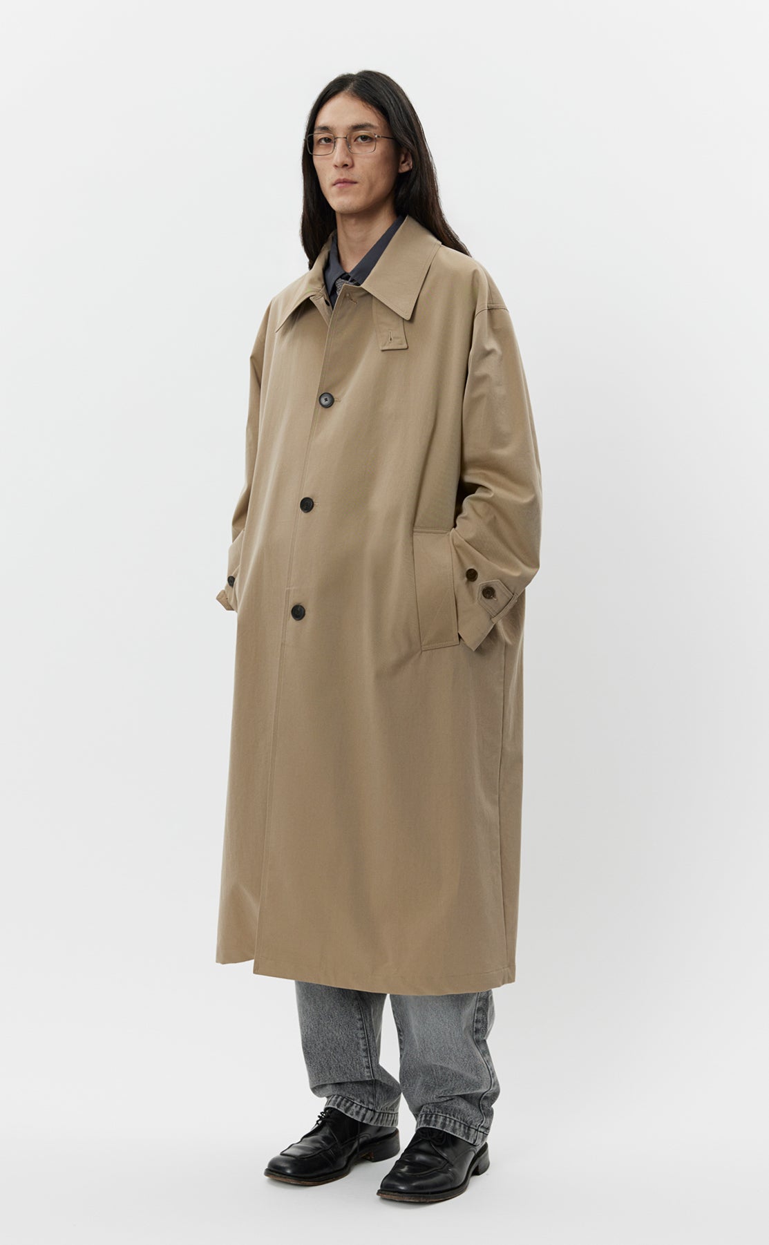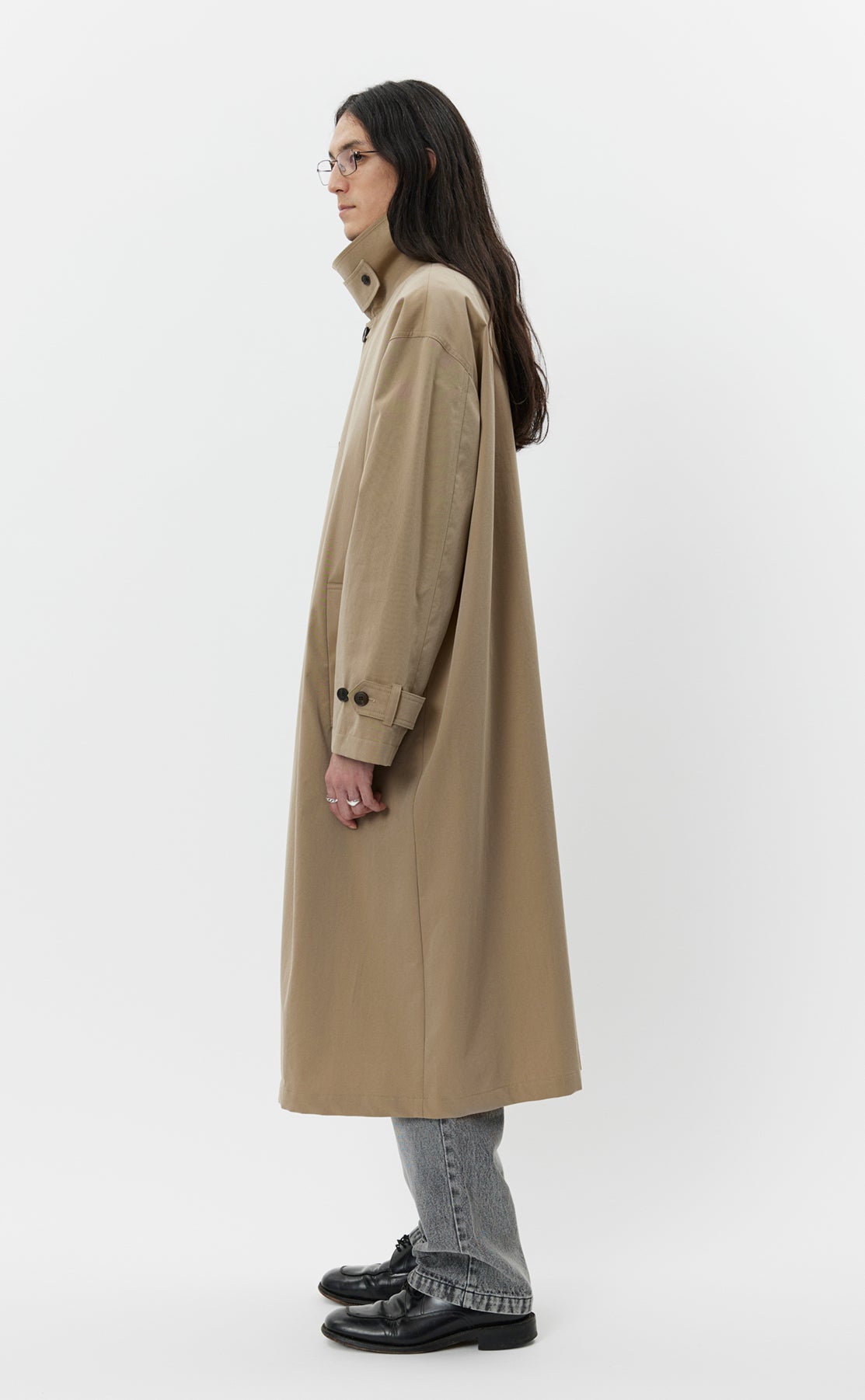 The Venture Coat is calf length with an oversized fit and drop shoulders. Made with button closure, removable storm collar tab, side pockets and rear vent. Cut from a coated water resistant Italian deadstock cotton in beige.
