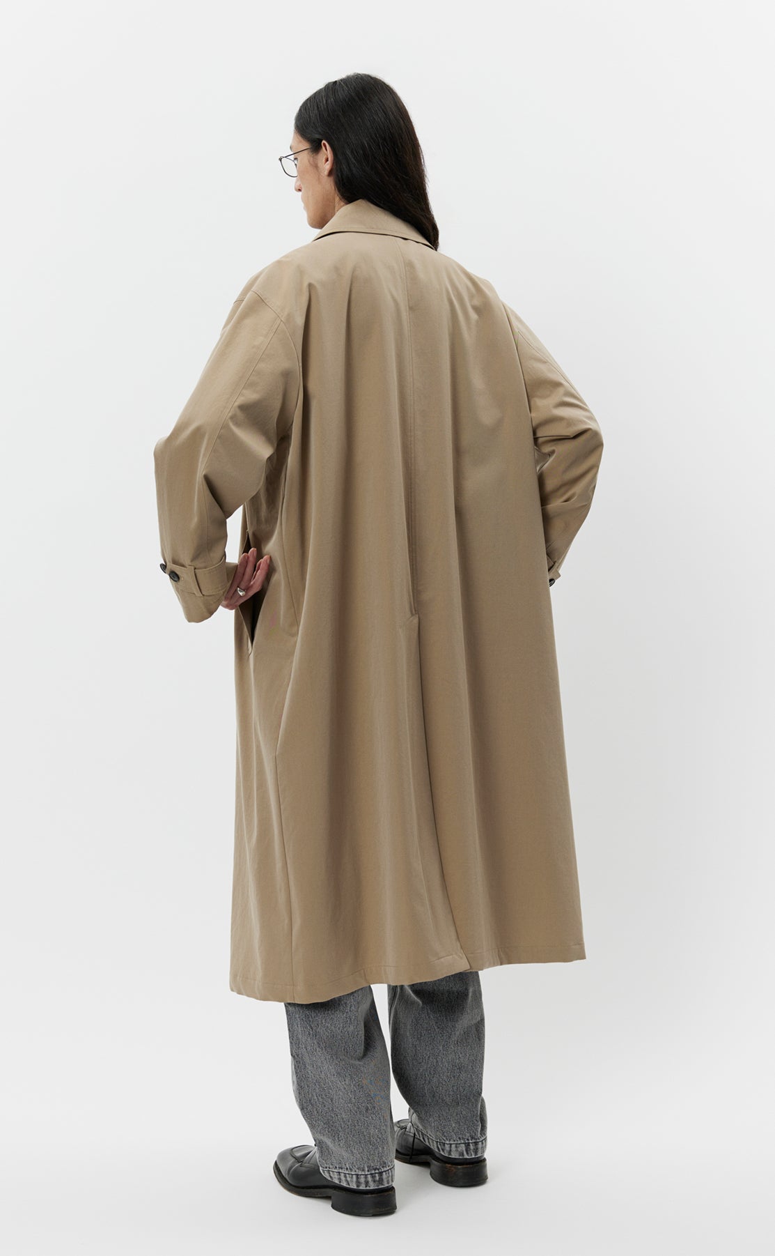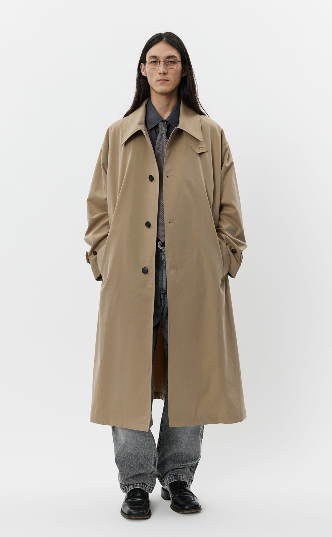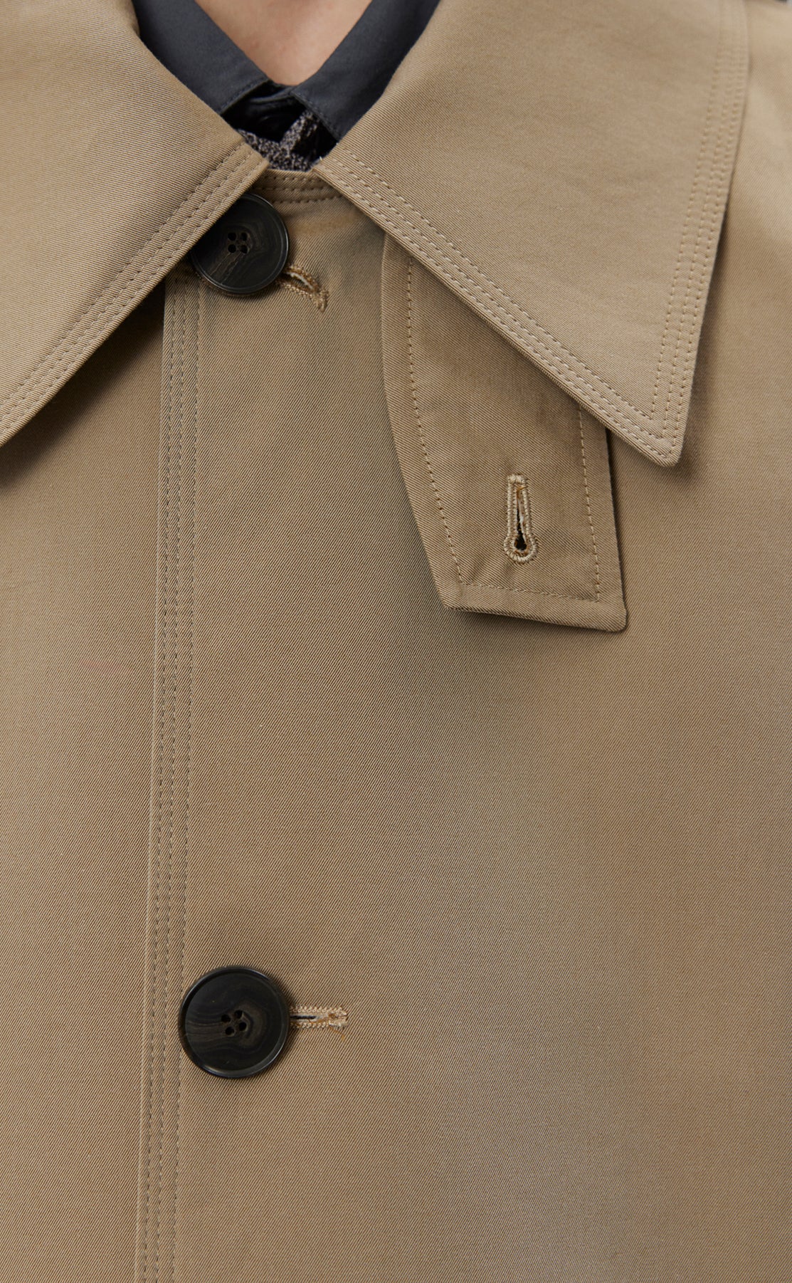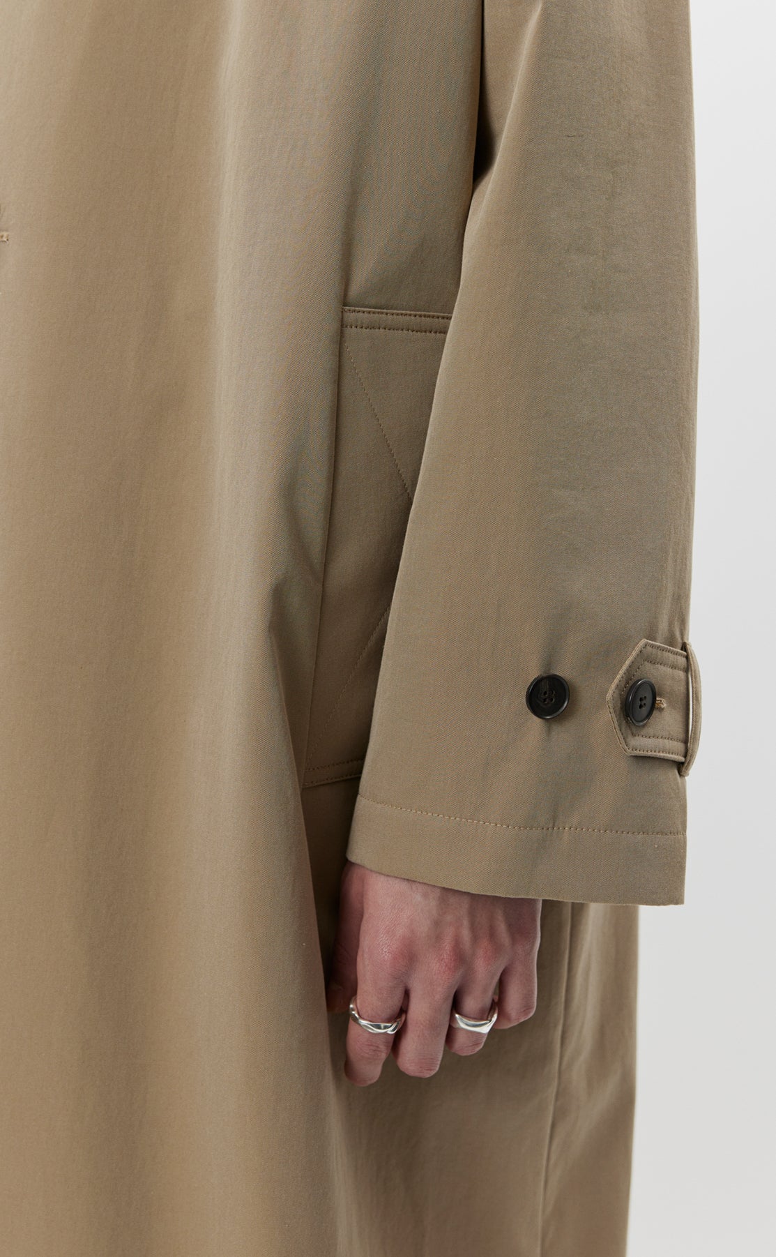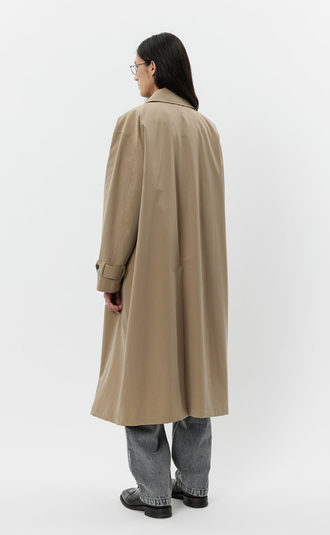 The Venture Coat is calf length with an oversized fit and drop shoulders. Made with button closure, removable storm collar tab, side pockets and rear vent. Cut from a coated water resistant Italian deadstock cotton in beige.