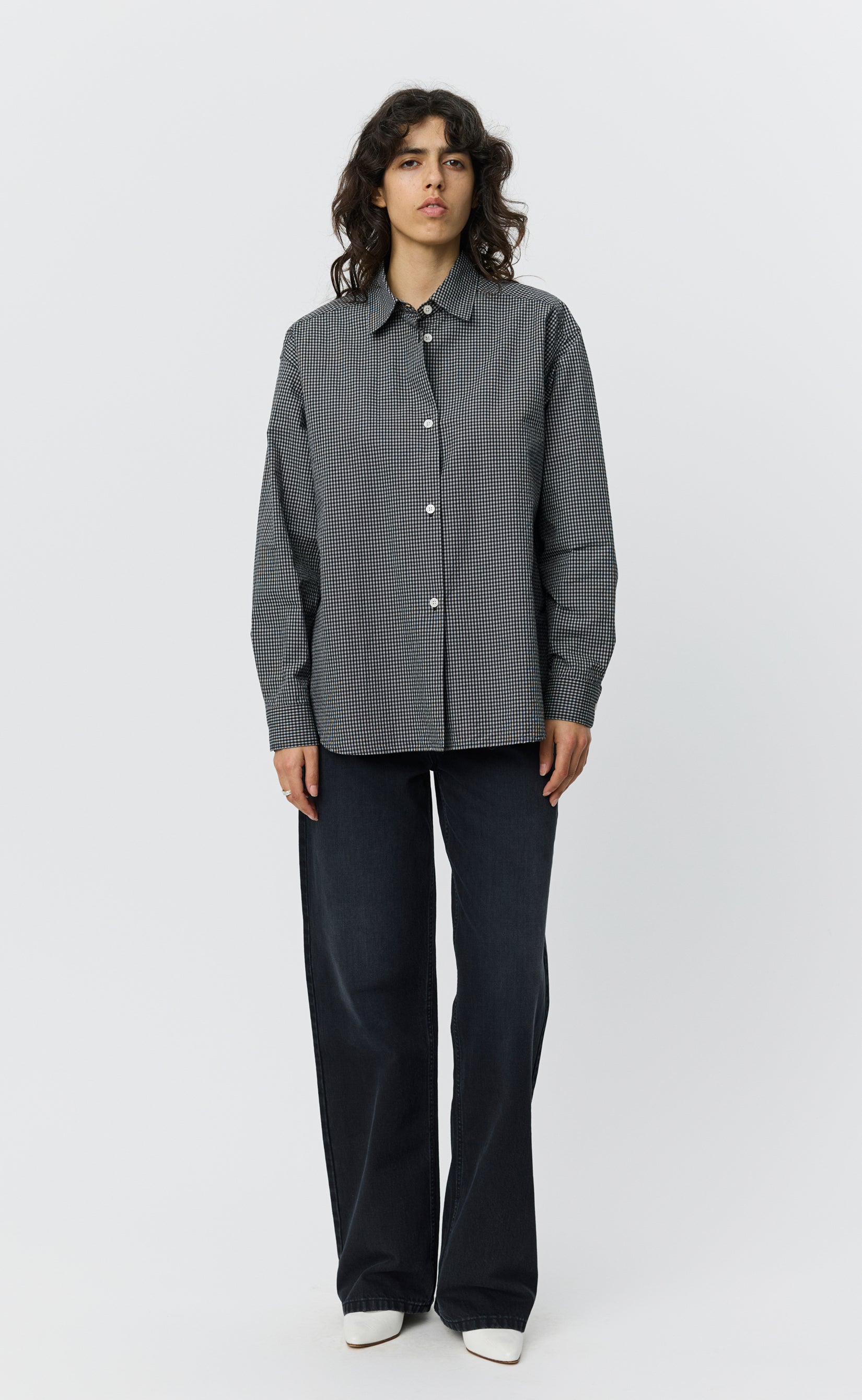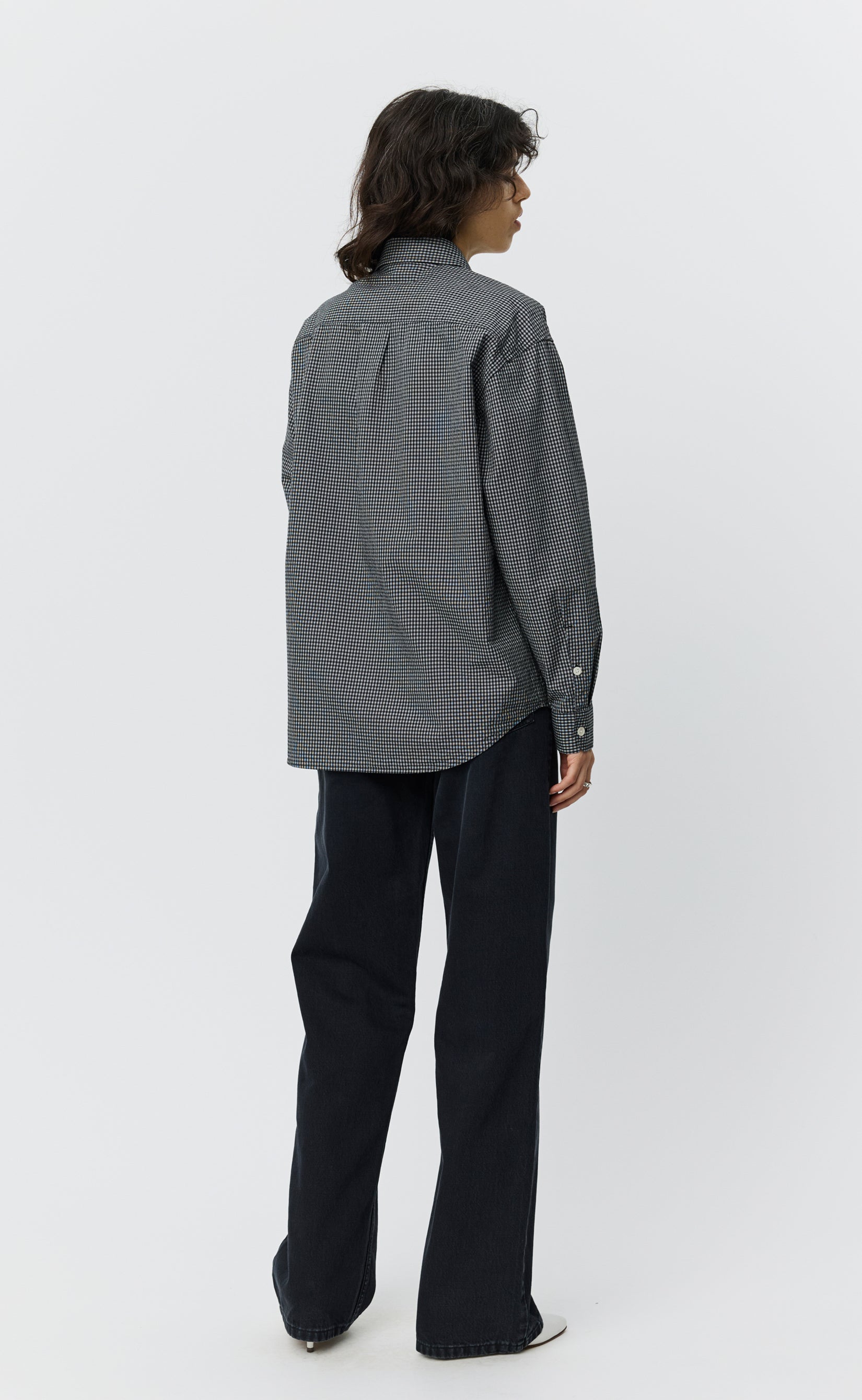 The Womens Generous Shirt has a relaxed fit with drop shoulders and a curved hem. Featuring a spread collar, back yoke pleats and clean front made without chest pocket and placket. Cut from a micro seersucker cotton with a dry hand feel, in a white fine check on a black ground.