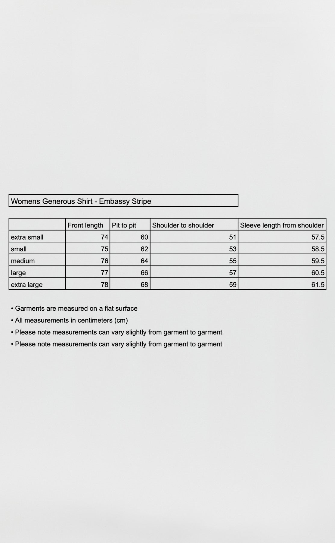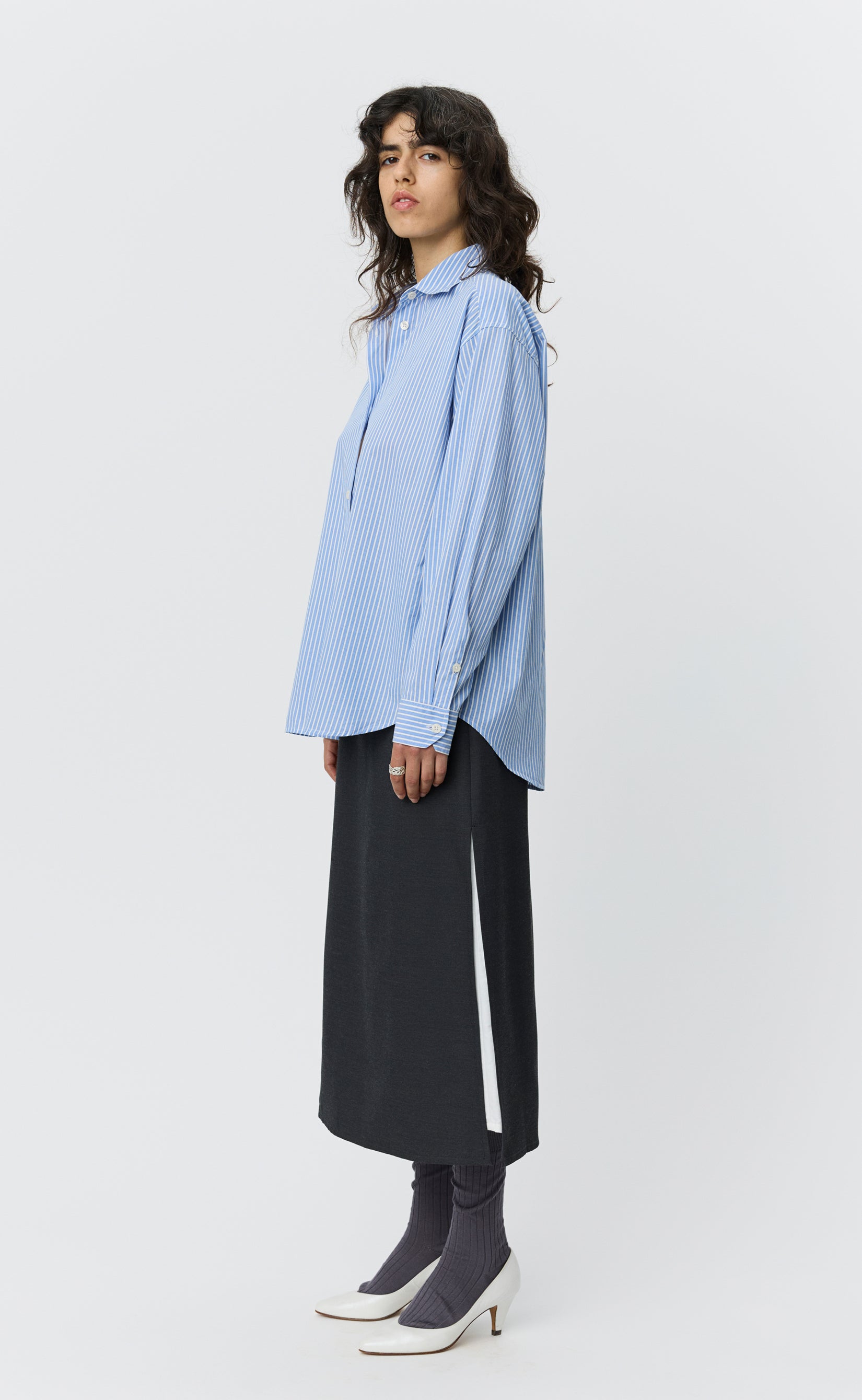 The Womens Generous Shirt has a relaxed fit with drop shoulders and a curved hem. Featuring a spread collar, back yoke pleats and clean front made without chest pocket and placket. Cut from a garment washed organic cotton poplin with a smooth hand feel, in a light grey and white multi stripe on a sky blue ground.