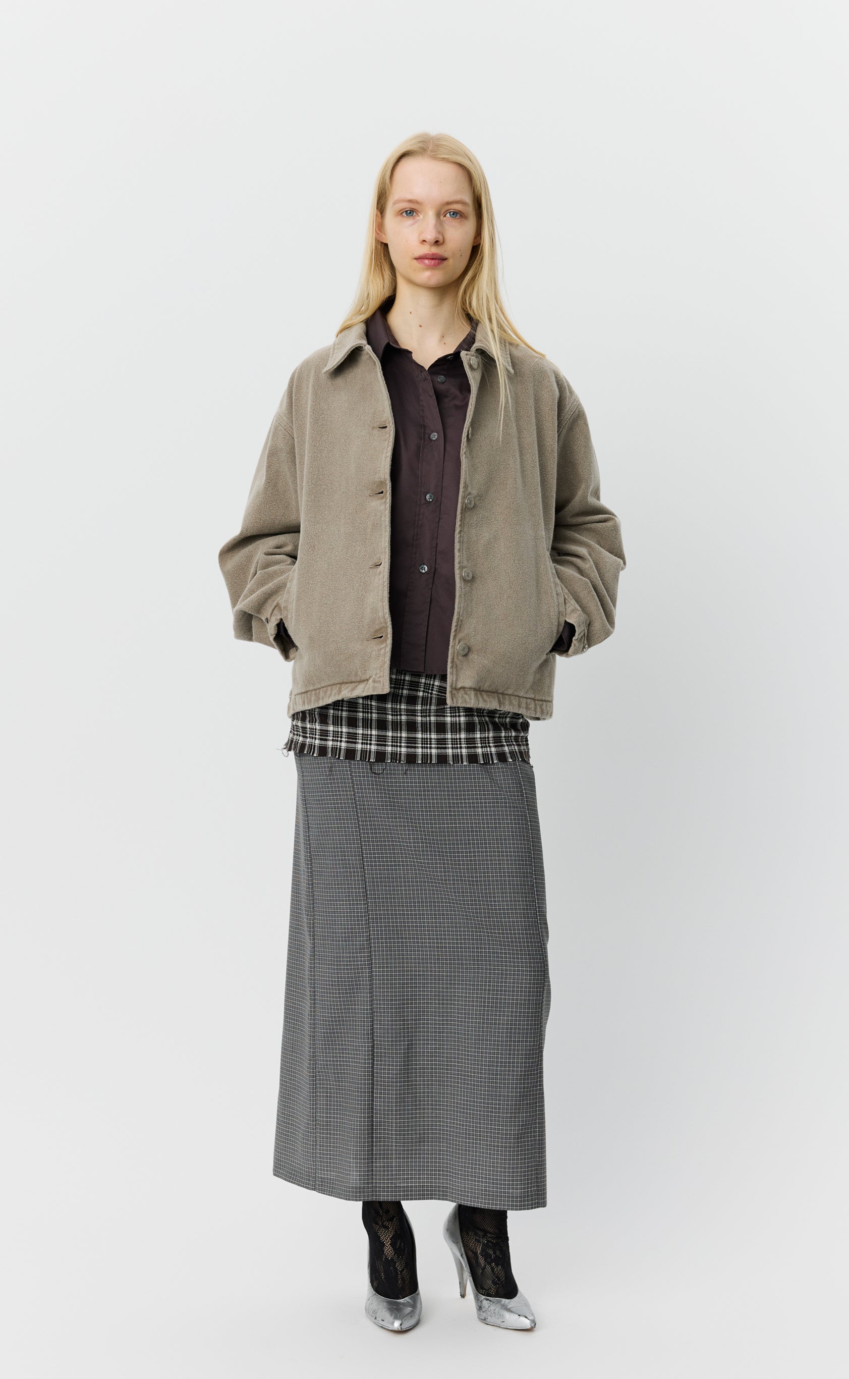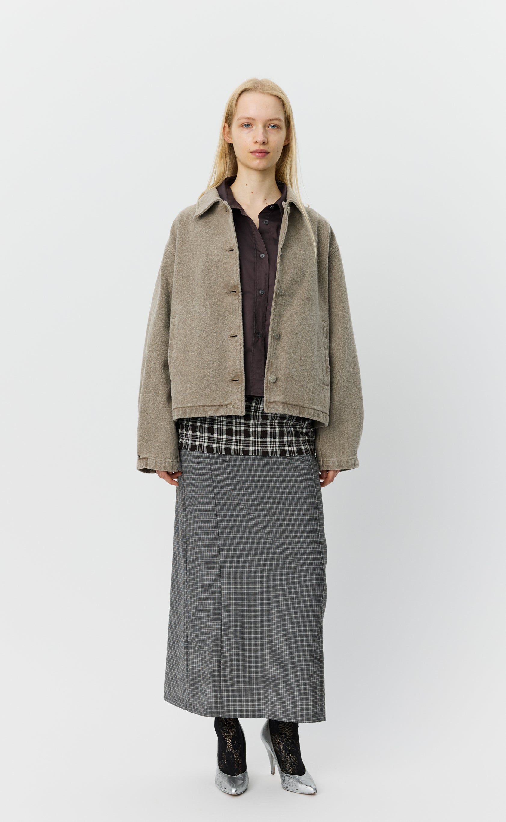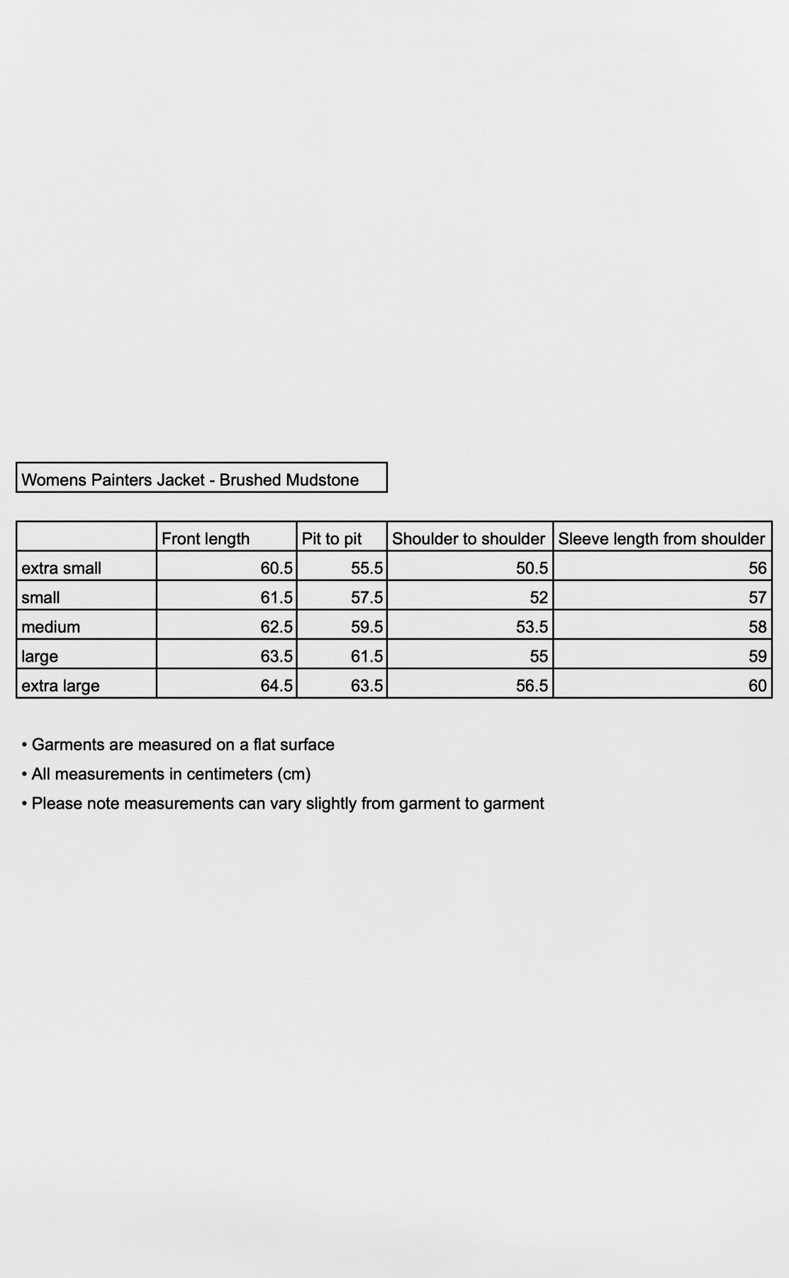 The Women's Painters Jacket has a relaxed fit with drop shoulders. Features welt side pockets, mfpen herrekvipering metal button closure and flower rivets at sleeves and side seams. Cut from a soft mineral dye washed organic cotton denim with a brushed surface in a light brown.